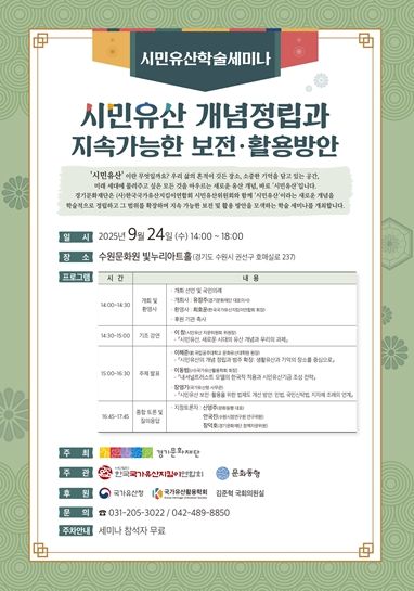 [경기경제신문] 경기문화재단은 오는 10월 24일 오후 2시, 수원문화원 빛누리아트홀에서 ‘시민유산 개념정립과 지속가능한 보전·활용방안’ 학술 세미나를 개최한다고 밝혔다. 세미나는 문화유산을 소수 전문가의 영역에서 시민 모두의 유산으로 확장하고, 그 가치를 지속가능하게 보전, 활용하는 방안을 모색하기 위해 기획됐다.