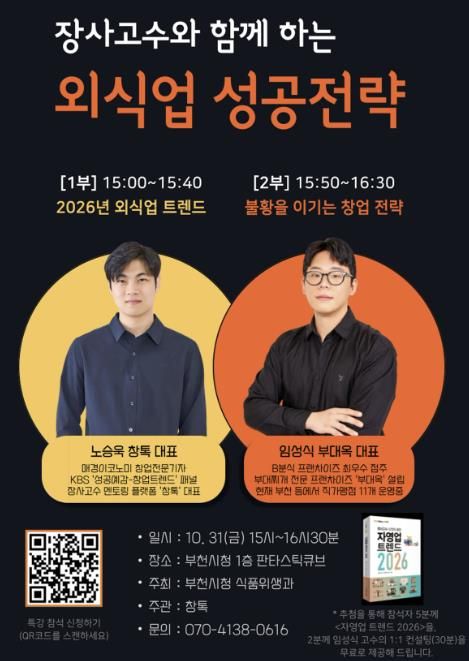 부천시는 이번 특강이 외식업 현장의 생생한 경험과 미래 전략을 동시에 얻는 기회가 될 것으로 보고 있다. 아울러 현장 참석자 중 추첨을 통해 ‘자영업 트렌드 2026(매경이코노미·창톡고수 지음)’ 신간 도서 5권을 증정하며, 임성식 대표의 무료 개인 맞춤 컨설팅도 함께 제공한다.