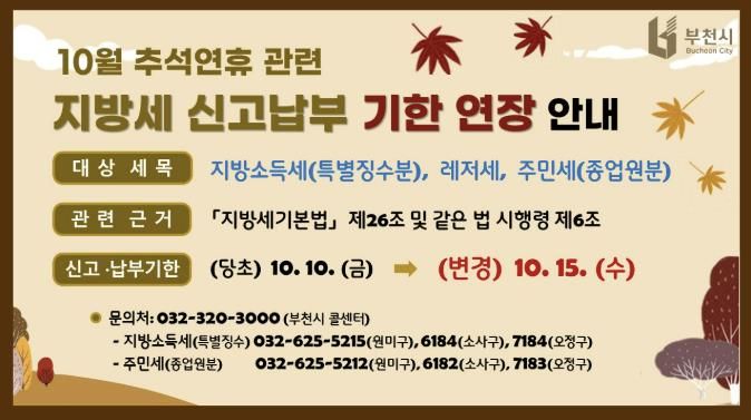 [경기경제신문] 부천시는 긴 추석 연휴로 인해 시민들이 지방세를 기한 내에 신고·납부하는 데 불편을 겪을 것으로 예상됨에 따라, 10월 납부 대상인 지방세 3종의 신고·납부 기한을 기존 10일에서 15일로 5일 연장한다고 밝혔다.