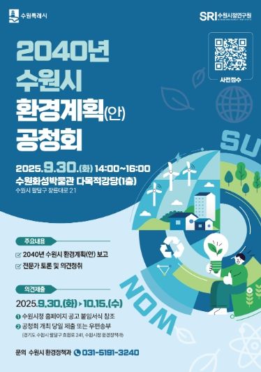 [경기경제신문] 수원특례시는 9월 30일 오후 2시 수원화성박물관 다목적강당에서 ‘2040년 수원시 환경계획(안)’ 공청회를 열고, 시민 의견을 듣는다.