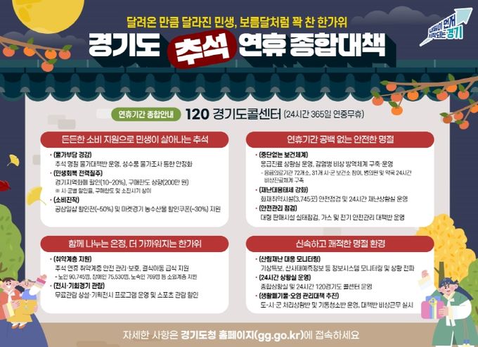 [경기경제신문] 경기도는 도민 모두가 안전하고 넉넉한 추석을 보낼 수 있도록 10월 3일부터 10월 9일까지 7일간 ‘추석 연휴 종합대책’을 추진한다. 도는 종합상황실을 24시간 운영하고 비상근무 체계를 가동해 연휴 중 발생할 수 있는 불편과 사고에 신속 대응할 방침이다.