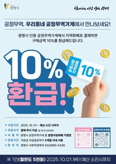 [경기경제신문] 광명시가 공정무역가게에서 광명사랑화폐(지역화폐)로 결제하면 결제금액의 10%를 돌려주는 ‘공정무역 실천 캐시백’ 행사를 진행한다고 9일 밝혔다.
