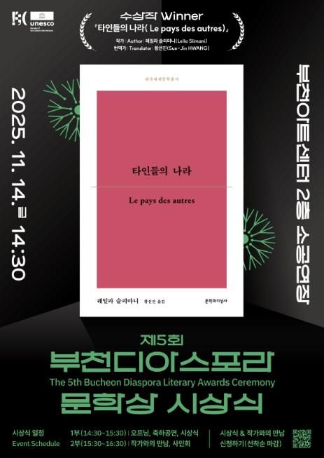 [경기경제신문] 부천시는 11월 14일 부천아트센터에서 열리는 ‘2025년 제5회 부천디아스포라문학상’ 시상식을 앞두고, 수상작으로 레일라 슬리마니 작가의 ‘타인들의 나라(Le pays des autres)’를 선정했다고 22일 밝혔다.