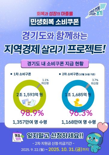 한편 경기도의 지난 1차 소비쿠폰의 지급률은 98.9%로 1,357만여 명이 소비쿠폰 2조 1,593억 원을 수령한 바 있으며, 26일 현재 1차와 2차를 거쳐 지급된 소비쿠폰(약 3조 3,275억 원)의 91.5%가 사용된 것으로 나타났다.