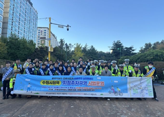 [경기경제신문] 수원특례시는 27일 수원시청역 일원에서 ‘공유자전거·킥보드(PM) 지정주차구역 시범운영 홍보 캠페인’을 펼쳤다.