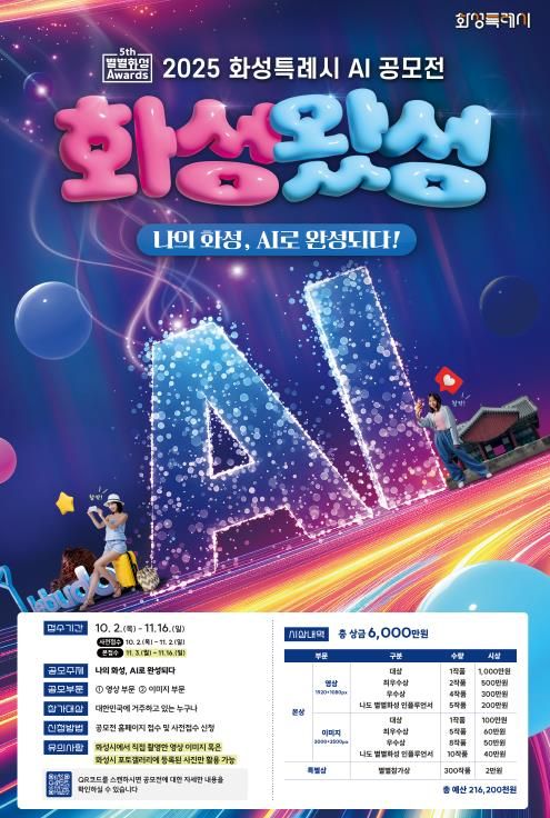 [경기경제신문] 화성특례시가 '2025 화성특례시 AI 공모전 – 화성왔성'의 사전접수를 총 832명이 마감한 데 이어, 11월 3일부터 16일까지 본접수를 진행한다고 밝혔다.