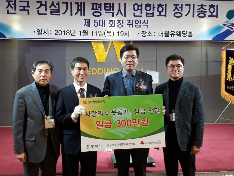 【경기경제신문】전국건설기계 평택시연합회(회장 손평호)는 지난 11일 제5대 회장 취임식을 맞아 어려운 이웃에게 써달라며 성금 300만원을 기탁했다.