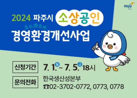신청을 희망하는 소상공인은 지원 신청 서류를 작성해 7월 1일부터 5일(9:00 ~18:00)까지 파주시청 일자리경제과(차고동 2층)로 방문해 신청하거나 한국생산성본부에 우편으로 제출하면 된다.