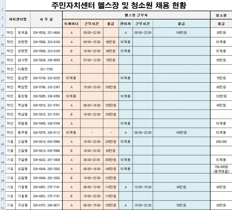이번에 용인시 관내 모든 주민자치센터에서 운영하던 "주민자치센터 헬스장 및 청소원 채용 현황"도 함께 공개돼 서로 비교해 볼 수 있게 됐다.