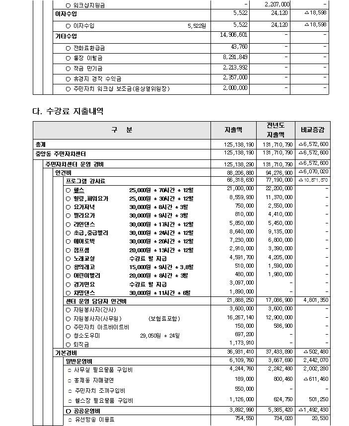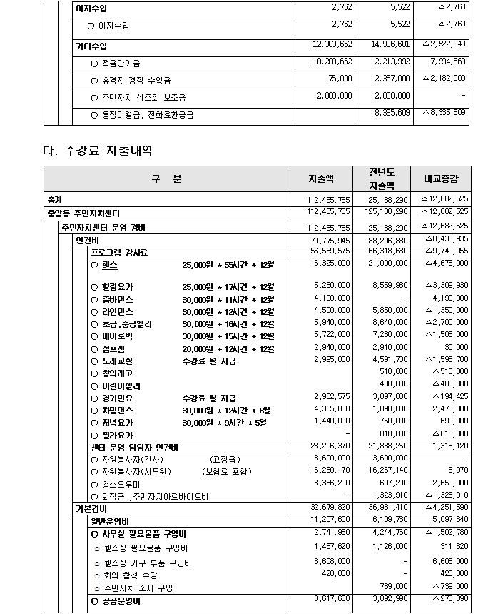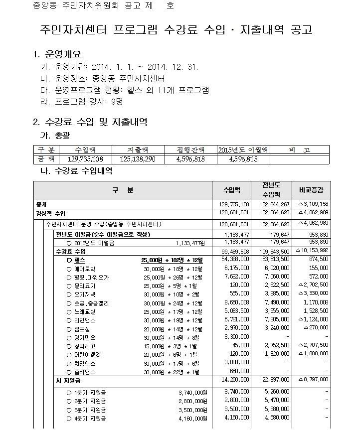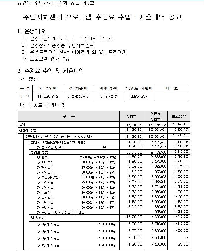 【경기경제신문】용인시 관내 한 주민자치센터는 헬스장을 운영하면서 헬스트레이너에게 월 175만원의 보수를 지급하다, 재정상태가 어렵다는 이유로 월 90만원으로 보수를 삭감한 후 그것도 모자라 휴식시간(5시간)마져 자원봉사란 명목으로 혹사시켜 오다, 계약만료 사유로 해임시켜 갑질논란을 빚였던 처인구 중앙동 "주민자치센터 프로그램 수강료 수입‧지출 내역"이 최근 정보공개 청구로 인해 전격 공개됐다.