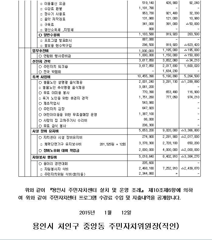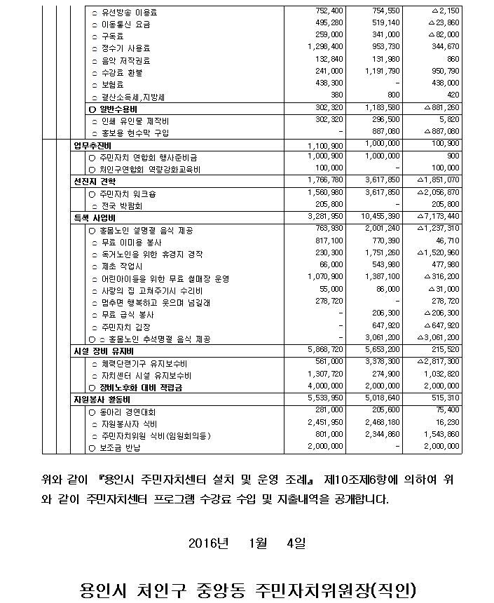 특히, 용인시 관내 주민자치센터 "주민자치센터 프로그램 수강료 수입.지출 내역"이 전부 공개됨으로서 용인시민의 알권리 충족과 주민자치 행정의 투명성 제고를 위해 본지에서는 공개된 자료를 기사로 발행하기로 결정했다.