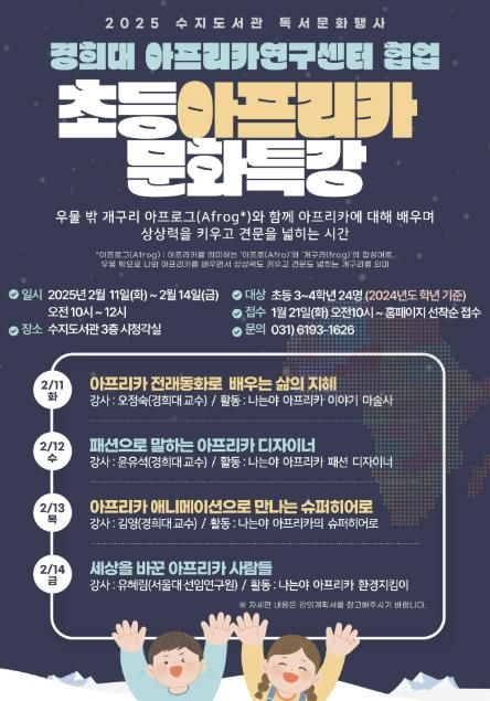 도서관 관계자는 “어린이들이 평소 접하기 어려운 아프리카에 대해 배우며 타문화에 대한 이해의 폭을 넓히는 유익한 시간이 되길 기대한다”며 “겨울 방학을 활용해 초등학생들이 많은 관심 가져주길 바란다”고 말했다.