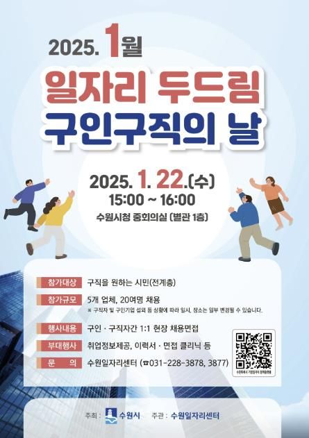 [경기경제신문] 수원시는 1월 22일 오후 3시부터 4시까지 시청 별관 1층 중회의실에서 ‘1월 일자리 두드림’ 채용행사를 연다.