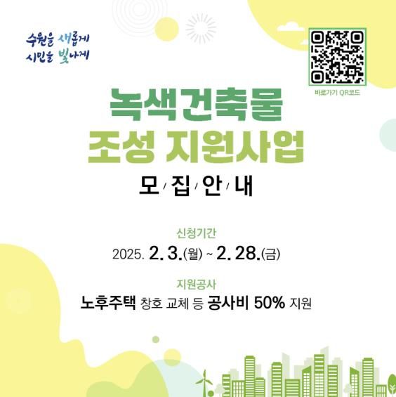 [경기경제신문] 수원시가 2월 3일부터 28일까지 ‘2025년 녹색건축물 조성 지원 사업’ 참여자를 모집한다.