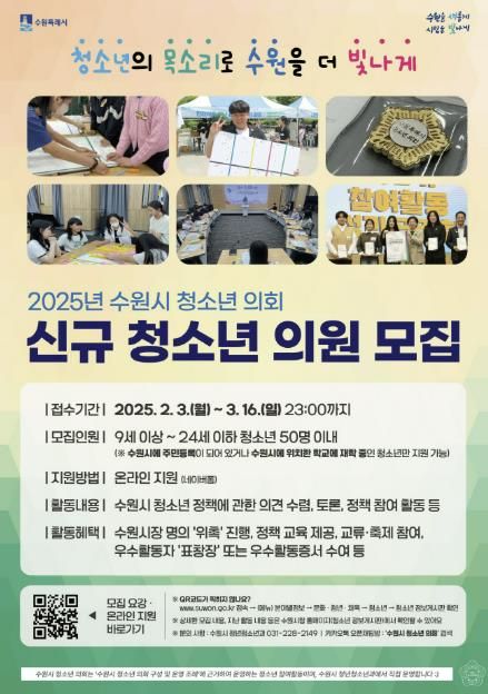 [경기경제신문] 수원시가 ‘2025년 수원시 청소년의회’에서 활동할 청소년의원을 3월 16일까지 모집한다.