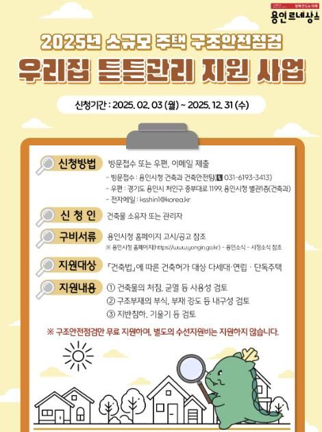 [경기경제신문] 용인특례시는 전국 최초로 일부 소규모 노후주택에 지원했던 무료 안전 점검을 모든 소규모 주택으로 확대 지원하는 ‘우리집 튼튼관리 지원 사업’을 시작했다고 4일 밝혔다.