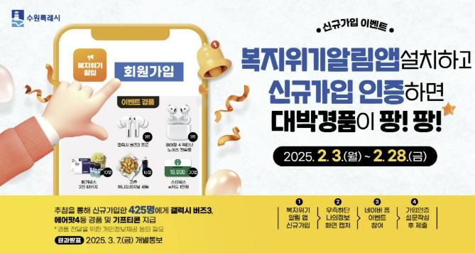 [경기경제신문] 수원시가 복지위기 가구 제보를 활성화하기 위해 2월 28일까지 ‘복지위기알림’ 앱 가입 이벤트를 연다.
