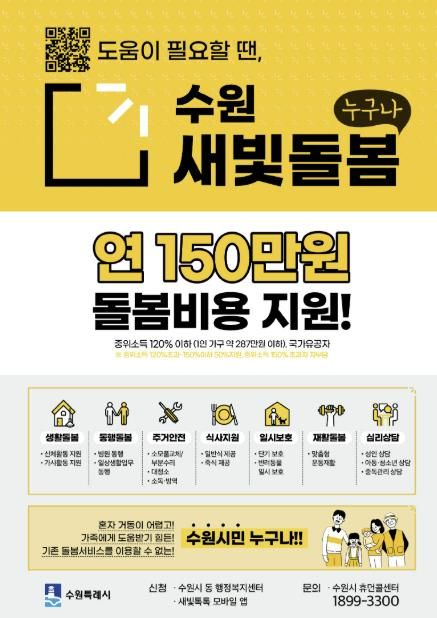 수원시 관계자는 “재탄생한 ‘수원새빛돌봄(누구나)’으로 더 촘촘한 사회안전망을 구축하고, 맞춤형 복지 시스템을 실현할 것”이라며 “시민 삶에 힘이 되는 돌봄도시 수원을 구축하기 위해 최선을 다하겠다”고 말했다.
