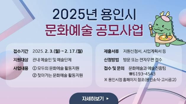 이상일 시장은 “다양한 분야에서 활동하고 있는 예술인들의 역량을 키우고 경제적으로도 도움을 주기 위해 지원사업을 마련했다”며 “이들 사업은 도시의 품격을 높이고, 시민들이 다양한 형태로 문화예술을 향유하는데 보탬이 될 것”이라고 말했다.