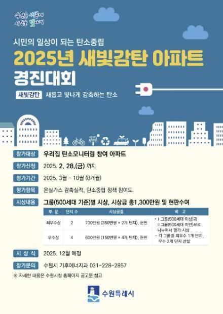 [경기경제신문] 수원시가 ‘우리집 탄소모니터링 사업’에 참여하는 아파트 단지를 대상으로 ‘2025년 새빛감탄 경진대회’를 연다.