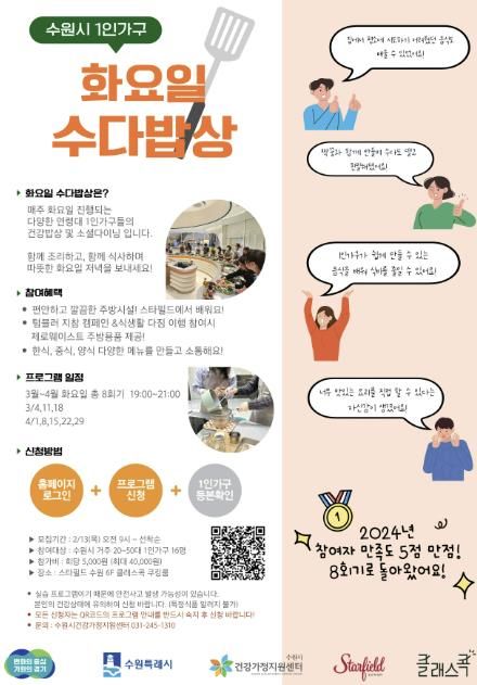 수원시 관계자는 “실생활에 도움이 되는 요리를 배우며, 소통할 기회를 제공하겠다”며 “1인 가구가 더 건강하고 균형 잡힌 삶을 살아갈 수 있도록, 지역사회에서 소통과 연결을 강화하는 데 힘쓰겠다”고 밝혔다.