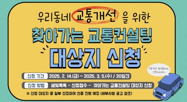 교통 개선을 희망하는 시민은 3월 5일까지 시정참여 플랫폼 ‘새빛톡톡’ 앱·홈페이지 ‘신청접수’ 게시판에서 신청하면 된다. 수원시는 3월 중 신청지를 검토한 후 찾아가는 컨설팅 대상지를 선정하고, 4월부터 ‘찾아가는 컨설팅’을 진행할 계획이다.