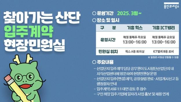 시는 월 2회 오후 1시부터 4시까지 현장민원실을 운영해 복잡한 입주계약 절차로 어려움을 겪는 입주기업에 상담 서비스를 제공한다. ‘기흥힉스’에는 매월 둘째주 목요일 A동 회의실, ‘기흥ICT밸리’는 매월 둘째주 금요일 B동 로비에 현장민원실이 마련된다.