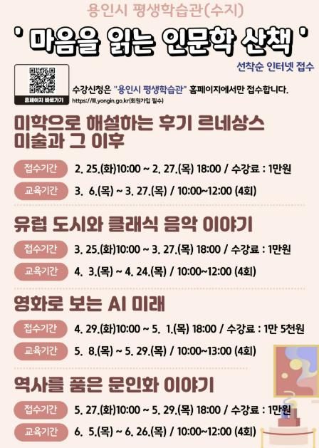 [경기경제신문] 용인특례시는 25일부터 ‘2025년 마음을 읽는 인문학 산책’ 수강생을 모집한다고 19일 밝혔다.