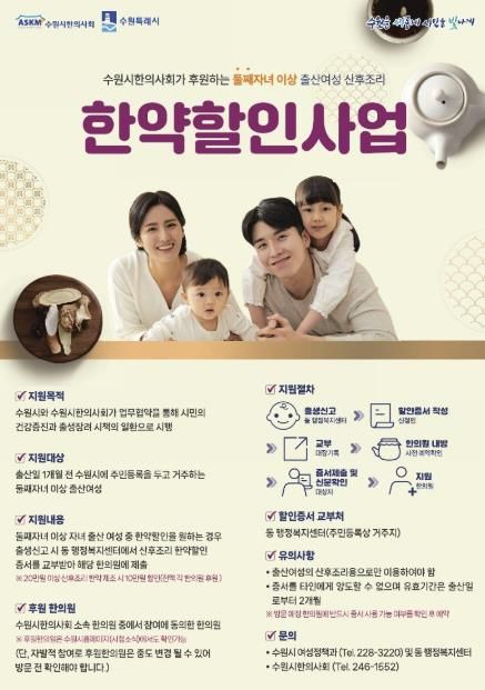 수원시와 수원특례시한의사회는 지난 2013년 산후조리 한약 할인 협약을 체결하고, 2024년까지 총 6500여 명의 수원시 산모를 지원했다. 지난 5일에는 저출생 극복 방안을 모색하는 간담회를 열고, 산후조리 한약 지원의 확대 방안과 홍보 방법 등을 논의했다.