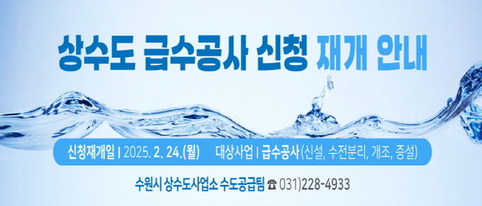 [경기경제신문] 수원시상수도사업소가 동절기 기온 하강으로 인한 부실 공사를 예방하기 위해 중단했던 상수도 급수공사를 재개한다. 2월 24일부터 신청할 수 있다.