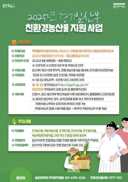 [경기경제신문] 용인특례시는 임산부에게 건강한 친환경 농산물을 제공하고 농가의 판로 개척을 돕는 ‘임산부 친환경농산물 지원사업’에 참여할 임산부를 모집한다고 25일 밝혔다.