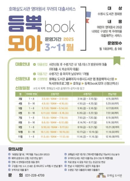 수원시 도서관 정회원이라면 누구나 신청할 수 있다. 매월 사전 대출 신청 기간에 수원시도서관 통합예약시스템 홈페이지에서 신청하고, 수령기간 내 호매실도서관 1층 데스크에서 수령하면 된다.