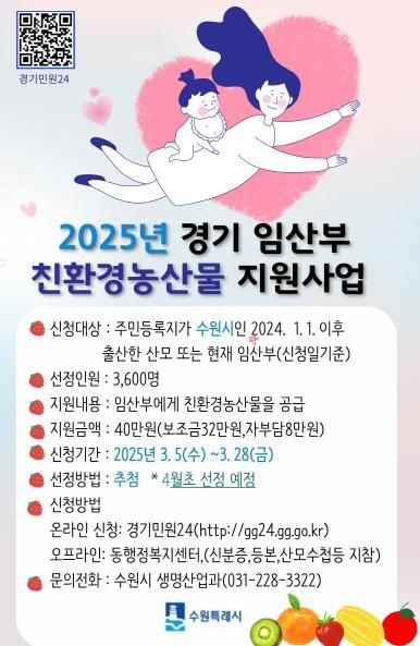[경기경제신문] 수원시가 임산부의 건강을 증진하고, 친환경농산물 소비를 촉진하기 위해 ‘2025년 경기임산부 친환경농산물 지원사업’을 추진한다. 임산부 3600명을 3월 28일까지 모집한다.