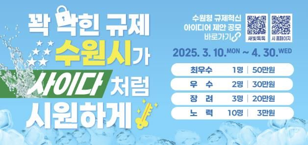 수원시 관계자는 “생활 속에 숨어있는 불합리한 규제를 개선할 수 있는 참신한 아이디어를 응모해 주시길 바란다”며 “시민이 체감할 수 있는 규제혁신을 위해 적극적으로 노력하겠다”고 말했다.