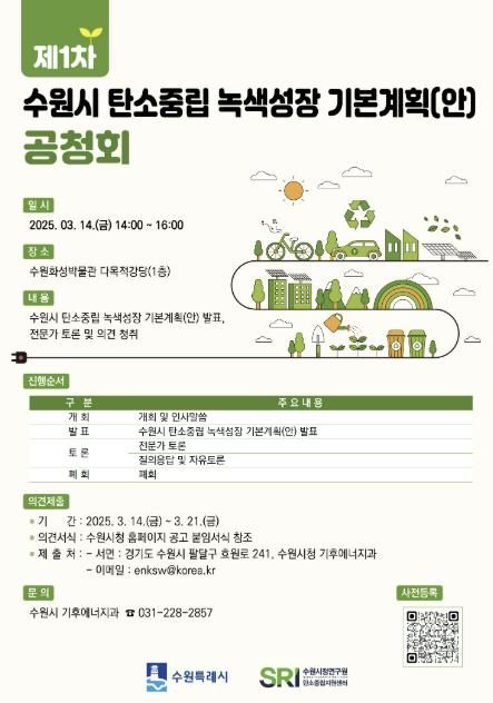 [경기경제신문] 수원시가 14일 수원화성박물관에서 제1차 탄소중립 녹색성장 기본계획(안) 공청회를 열고 시민·전문가 의견을 듣는다. 참여를 원하는 시민은 13일까지 홍보물 내 QR코드에 연결된 웹페이지에서 신청하면 된다.
