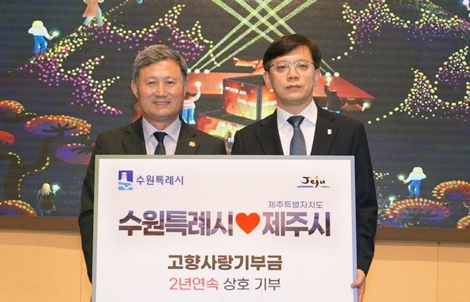 [경기경제신문] 수원시가 자매도시인 제주시와 ‘고향사랑 상호기부식’을 열고, 협력을 약속했다.