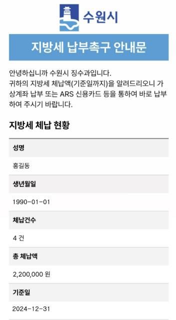 [경기경제신문] 수원시가 ‘모바일 전자고지 시스템’을 활용해 지방세와 세외수입 체납자 16만여 명을 대상으로 올해 12월까지 전자문서 형태의 체납안내문을 발송한다.