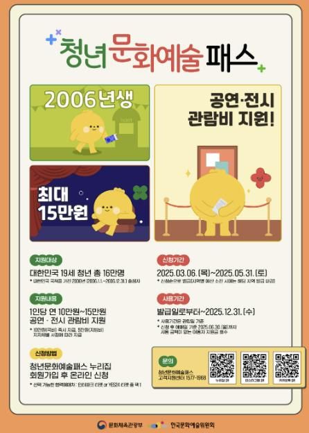 문화체육관광부가 주관하는 ‘청년문화예술패스’는 전국 19세 청년을 대상으로 공연·전시 관람비를 1인당 최대 15만 원 지원하는 사업이다. 수원시는 2024년부터 해당 사업에 참여해 지방비를 지원하고 있다.
