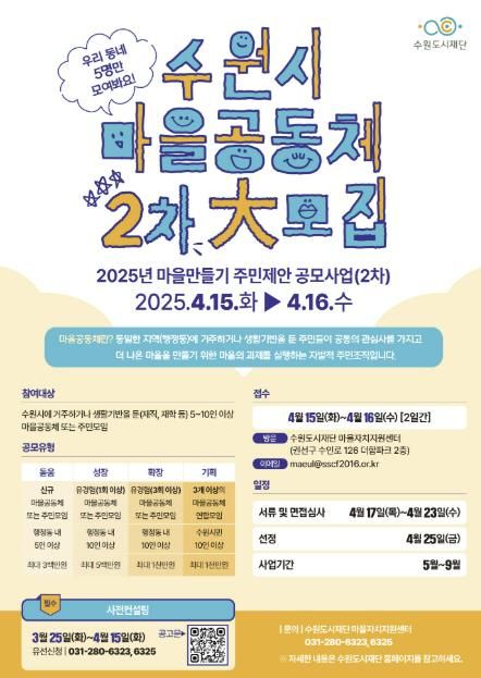 [경기경제신문] 수원시가 ‘2025년 마을만들기 주민제안 공모사업’ 2차 모집을 한다.