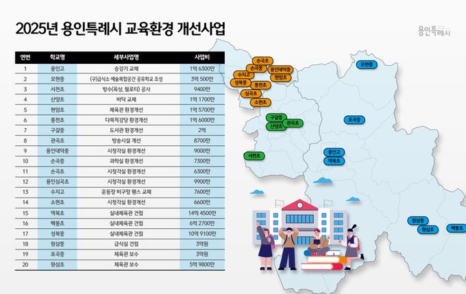 용인특례시는 민선 8기 이상일 시장 취임 이후 현재까지 총 165개교에 학생 통학안전, 교육환경 개선 등의 사업을 진행했으며, 교육부 특별교부금 확보 등 외부 재원을 포함해 모두 698억원의 예산을 투입했다.