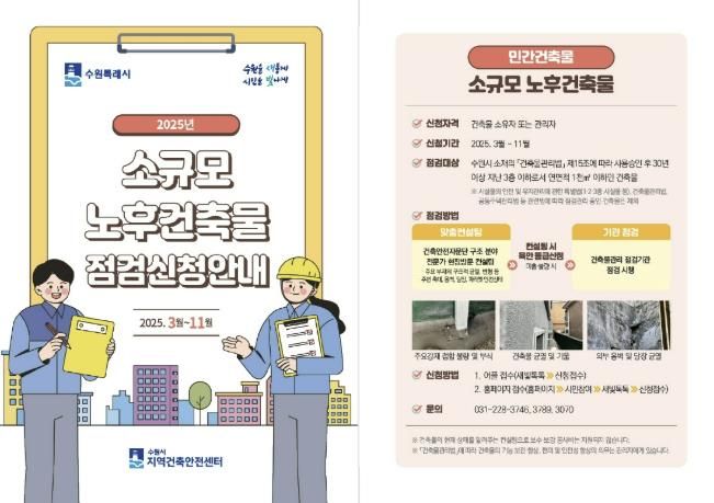 수원시 관계자는 “소규모 노후건축물 안전 점검으로 시민 불안감을 해소하고 건축물의 지속적인 유지·관리를 유도할 계획”이라며 “건축 안전사고 예방을 위한 지원을 확대해 나가겠다”고 말했다.