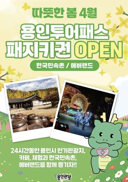 [경기경제신문] 용인특례시는 용인의 유료 관광지와 카페 등에서 사용할 수 있는 관광패스권인 ‘용인투어패스’로 전통문화 테마파크 ‘한국민속촌’과 대형 테마파크 ‘에버랜드’를 이용할 수 있는 새로운 여행 패키지 상품을 출시했다고 11일 밝혔다.