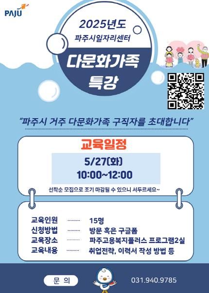 이번 프로그램은 취업을 준비하는 다문화 구성원을 대상으로 실질적인 구직 역량을 강화할 수 있도록 기획됐다. 특강은 5월 27일 파주시 고용복지플러스센터(MH타워 8층)에서 무료로 제공되며, ▲성공적인 취업 전략 ▲직장 내 기본 예절 ▲이력서·자기소개서 작성법 ▲면접 대비 방법 등에 대한 교육이 제공된다.