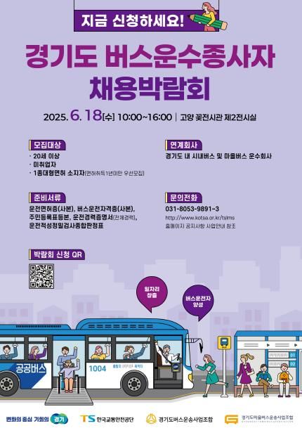 [경기경제신문] 경기도가 6월 18일 고양시 꽃전시관 제2전시실에서 버스 운수종사자 채용박람회를 연다. 오전 10시부터 오후 4시까지 진행되는 이번 박람회는 경기도가 주최하고 한국교통안전공단 화성교통안전체험교육센터가 주관하며, 도내 47개 주요 버스운송업체가 참여해 신규 운수종사자를 모집한다.