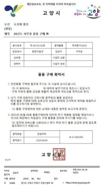 시 관계자는 “의심스러운 연락을 받은 경우 반드시 시 누리집(홈페이지)에 안내된 부서 행정 전화번호로 연락해 사실 여부를 확인하기 바란다”며 “고양특례시는 어떠한 경우에도 개인 휴대전화로 물품 납품을 요구하거나 개인 계좌로 입금을 요구하지 않는다”는 점을 강조했다.