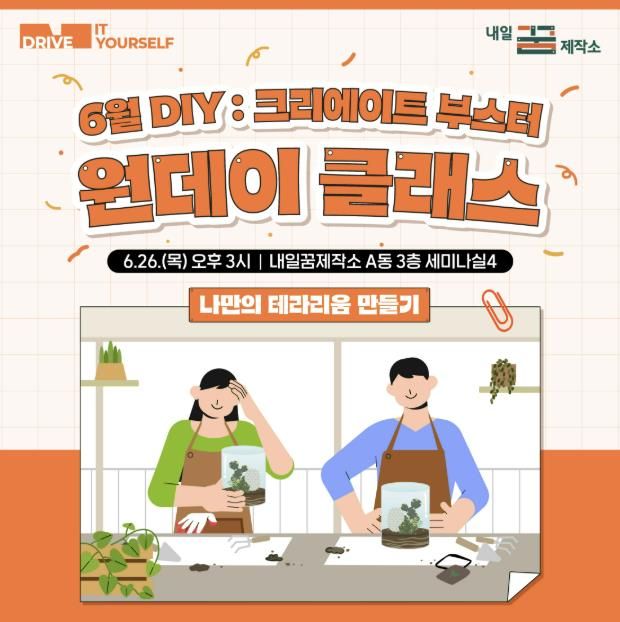오는 26일 진행되는‘나만의 플라워 테라리움 만들기’원데이 클래스는 현재 절찬리 접수 중이다. 빠른 마감이 예상되니 내일꿈제작소 누리집에서 신청하거나, 내일꿈제작소 카카오톡 플러스 친구추가를 해두는 것도 방법이다.