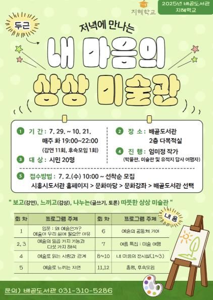 배곧도서관은 ‘저녁에 만나는 내 마음의 상상미술관’이라는 주제로 미술인문학 프로그램을 운영한다. 현대인이 느끼는 정신적 공허감을 해소하고 인문학적 사고를 확장하기 위해 기획된 이 프로그램은 7월 29일부터 10월 21일까지 매주 화요일 오후 7시부터 10시까지 총 12회에 걸쳐 진행된다.