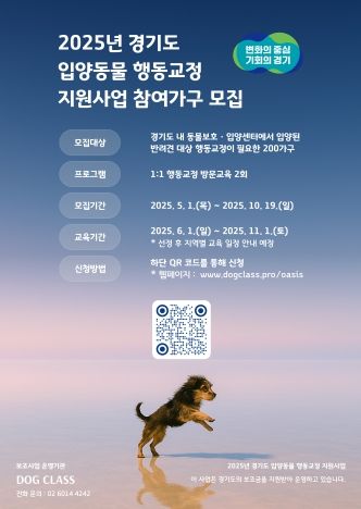 [경기경제신문] 경기도는 입양동물의 가정 내 적응을 돕고, 유기동물 예방과 파양율 감소를 목표로 하는 ‘2025년 경기도 입양동물 행동교정 지원’ 사업 참여 신청 기한을 당초 5월 말에서 10월 19일로 연장하기로 했다고 27일 밝혔다.