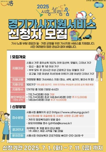 홍성림 시흥시 여성보육과장은 “일과 돌봄을 병행하며 가사 부담이 큰 가정을 위해 실질적인 도움이 되는 서비스를 마련했다”라며 “앞으로도 다양한 생활 지원 정책을 통해 시민 삶의 질 향상에 기여하겠다”라고 말했다.