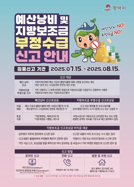 [경기경제신문] 평택시는 오는 7월 15일부터 8월 15일까지 예산 낭비 및 지방보조금 부정수급 근절을 위한 ‘집중 신고 기간’을 운영한다고 밝혔다.